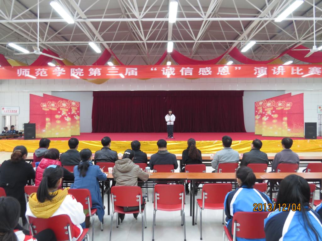 12月4日下午,必赢3003no1线路检测中心 第三届“励志自强,感恩诚信”主题演讲比赛在大学生活动中心顺利举办。学生处处长师建林、团委书记张春兴、资助中心主任赵军侠、必赢3003no1线路检测中心全体领导班子出席了本次比赛。郝正全、王泉珍、雷立英、吴胡清、辛晓峰老师担任了本次比赛评委。