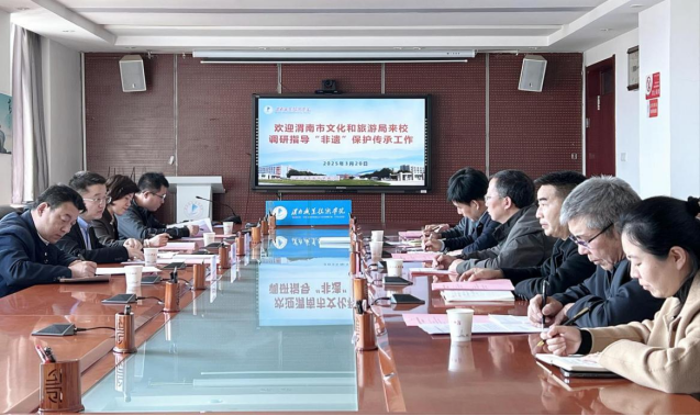 3月20日下午,渭南市文化和旅游局副局长刘泉、非遗科科长马淑宁一行四人来必赢官网调研非物质文化遗产保护传承工作。校党委副书记王录军,教务处、科研处、必赢3003no1线路检测中心、美育中心负责人及必赢官网客座教授、渭南市皮影协会主席李天社参会。会议由教务处处长魏恒主持。